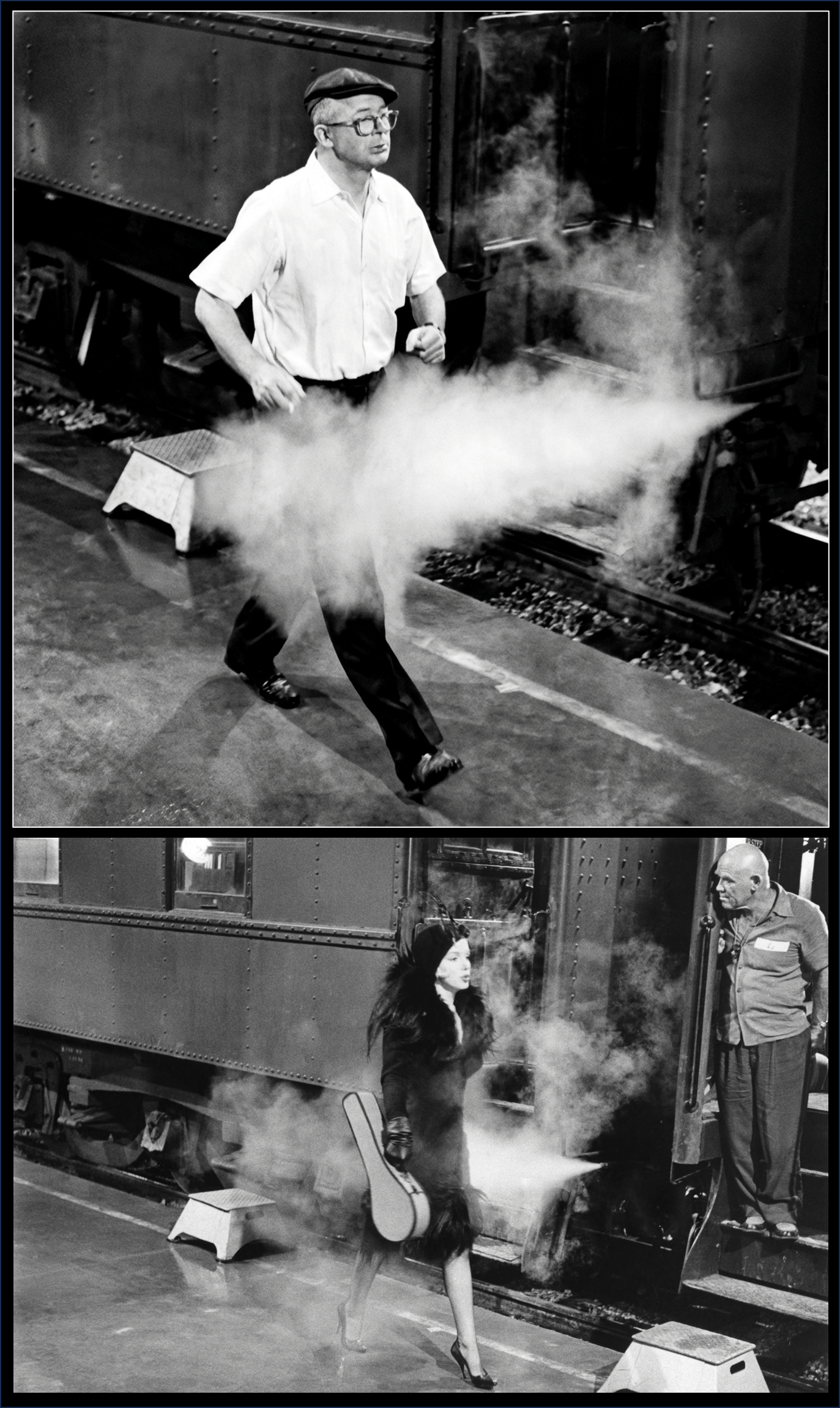 Director Billy Wilder demonstrating how he wants Marilyn Monroe to walk in her opening train departure scene in Some Like It Hot, Warner Bros. Studios, Burbank, CA, 1958