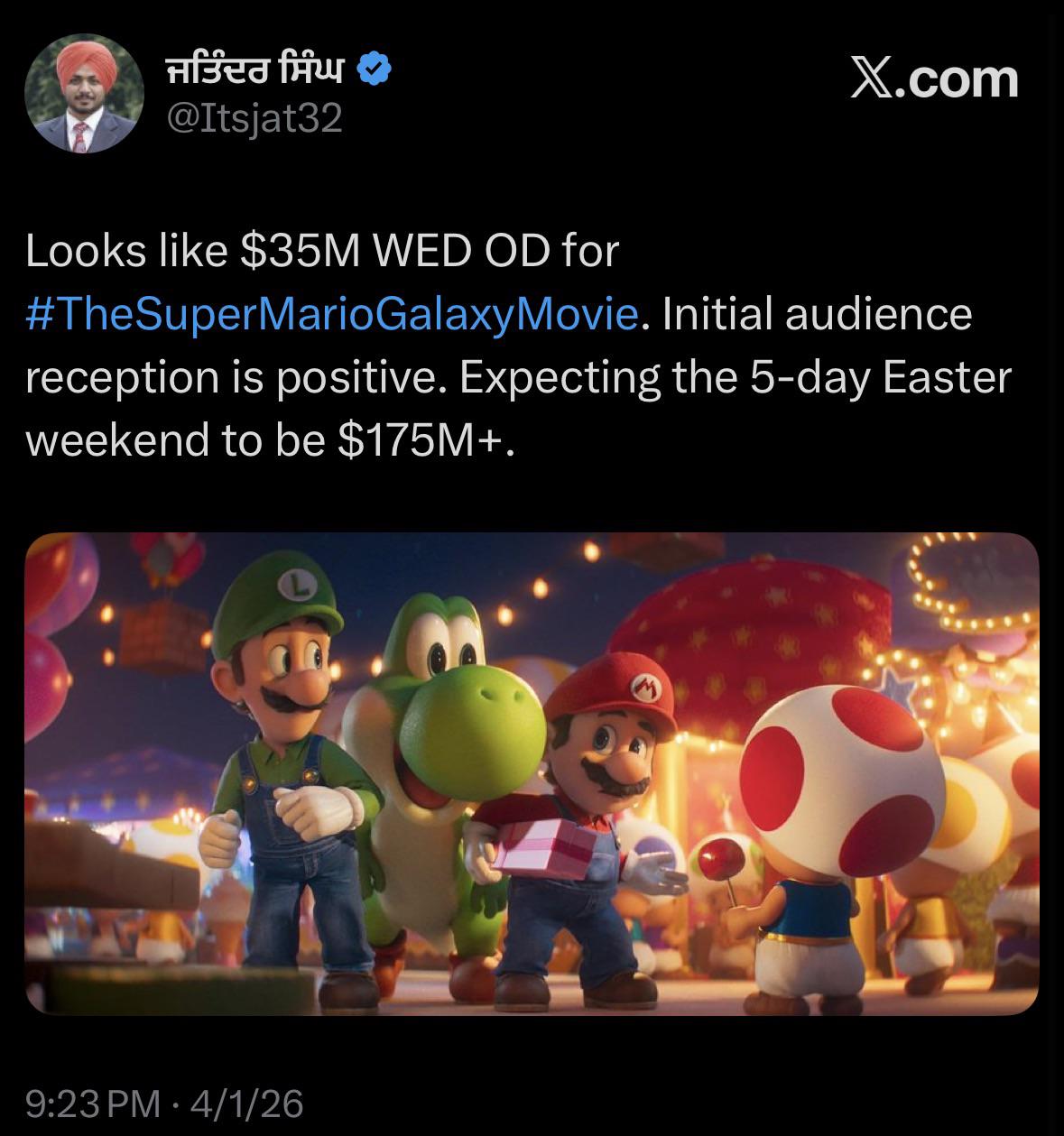 Looks like $35M WED OD for #TheSuperMarioGalaxyMovie. Initial audience reception is positive. Expecting the 5-day Easter weekend to be $175M+. by TiredWithCoffeePot