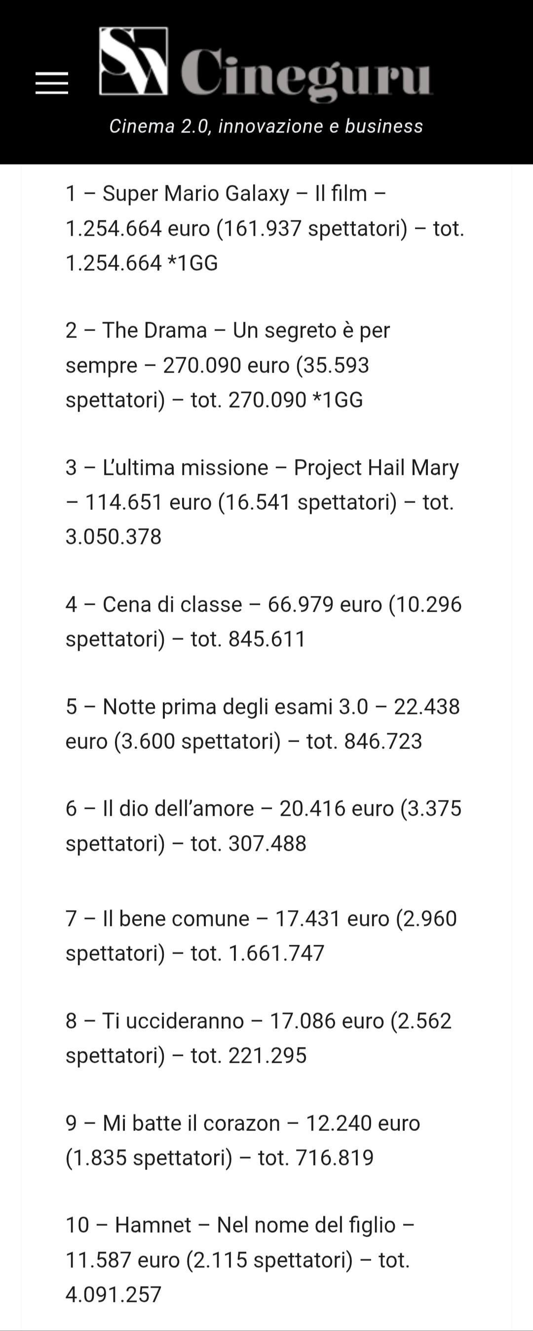 >Super Mario Galaxy – The Movie  has had an excellent start, grossing €1,254,664 and averaging €2,704 in 464 theaters. This is identical to that of Super Mario Bros. , which opened on Wednesday, April 5, 2023, with €1,256,759, an opening weekend gross of €5,756,237, and a five-day gross of €7,012,995 (Wednesday-Sunday). The film's total gross was €20,446,719, the highest gross for an animated title released in April.Â