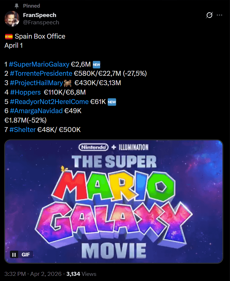 Spain box office APRIL 1. Super Mario Galaxy had a record opening day for an animated movie. 10-15 million dollar OW is is cards. Record attendence was seen on 1 april since july 2023.