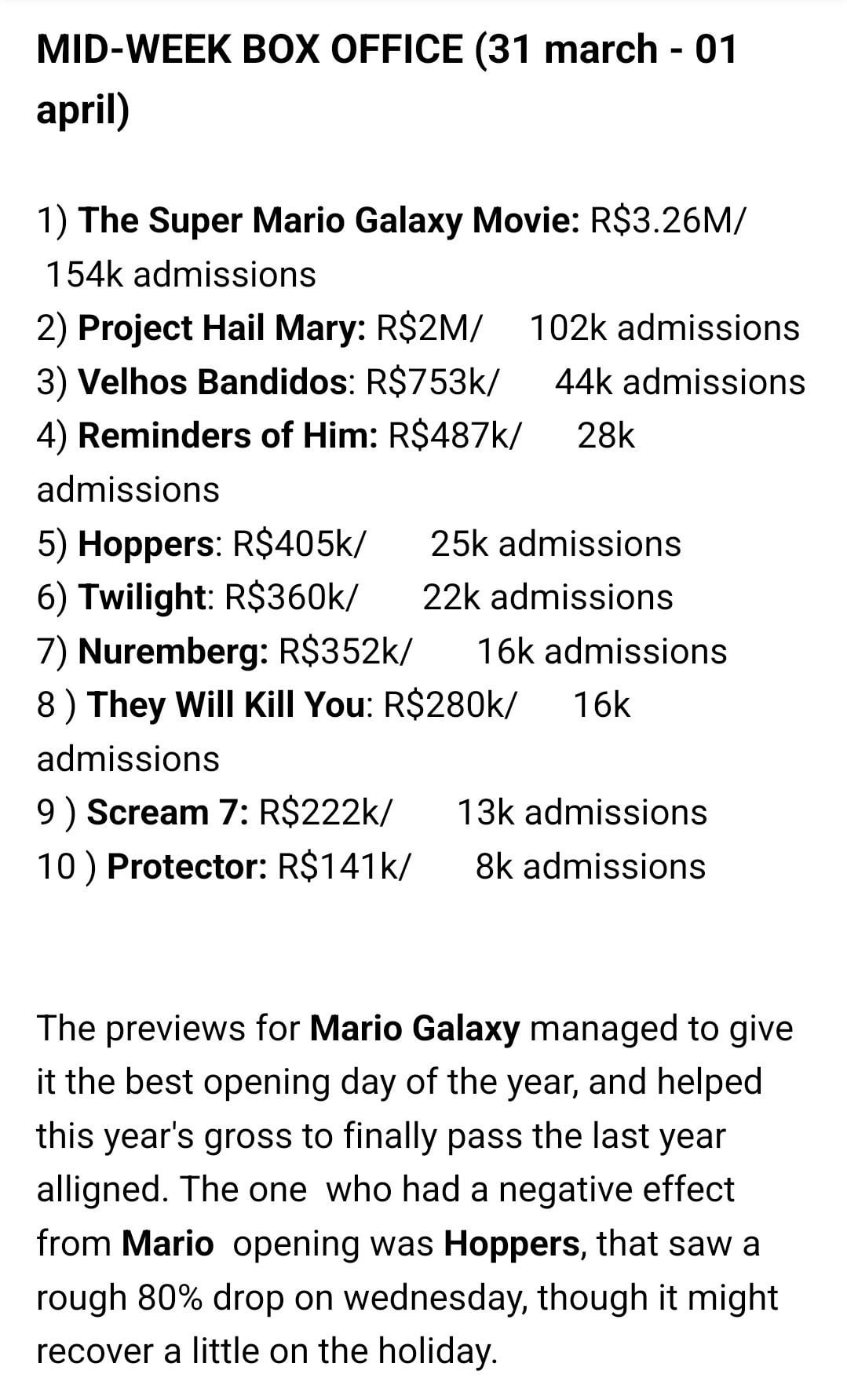 Amazon MGM Studios’ Project Hail Mary grossed $4.36M on Wednesday (from 4,077 locations). Total domestic gross stands at $181.57M.April 2, 2026