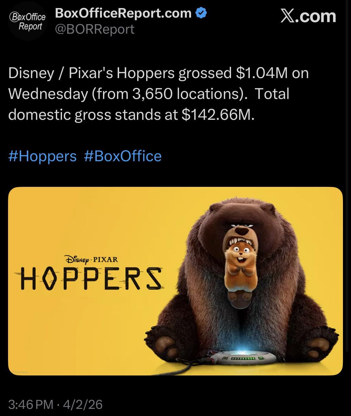 Disney / Pixar’s Hoppers grossed $1.04M on Wednesday (from 3,650 locations). Total domestic gross stands at $142.66M.