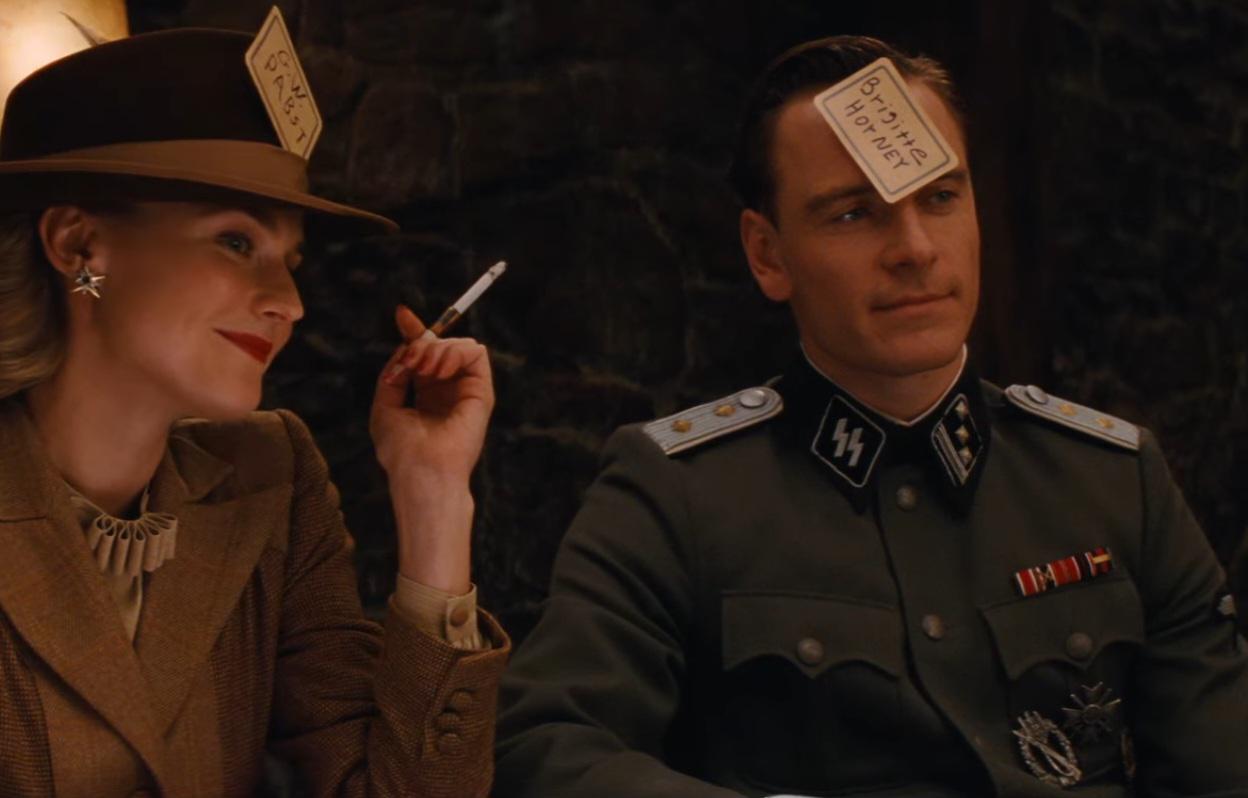 In this scene, the Gestapo Major writes the card for Lt. Hicox (they all pass to the right) and Hicox is a British spy pretending to be German. Brigitte Horney was a German actress that starred in a British war film about spies called Secret Lives (1937).