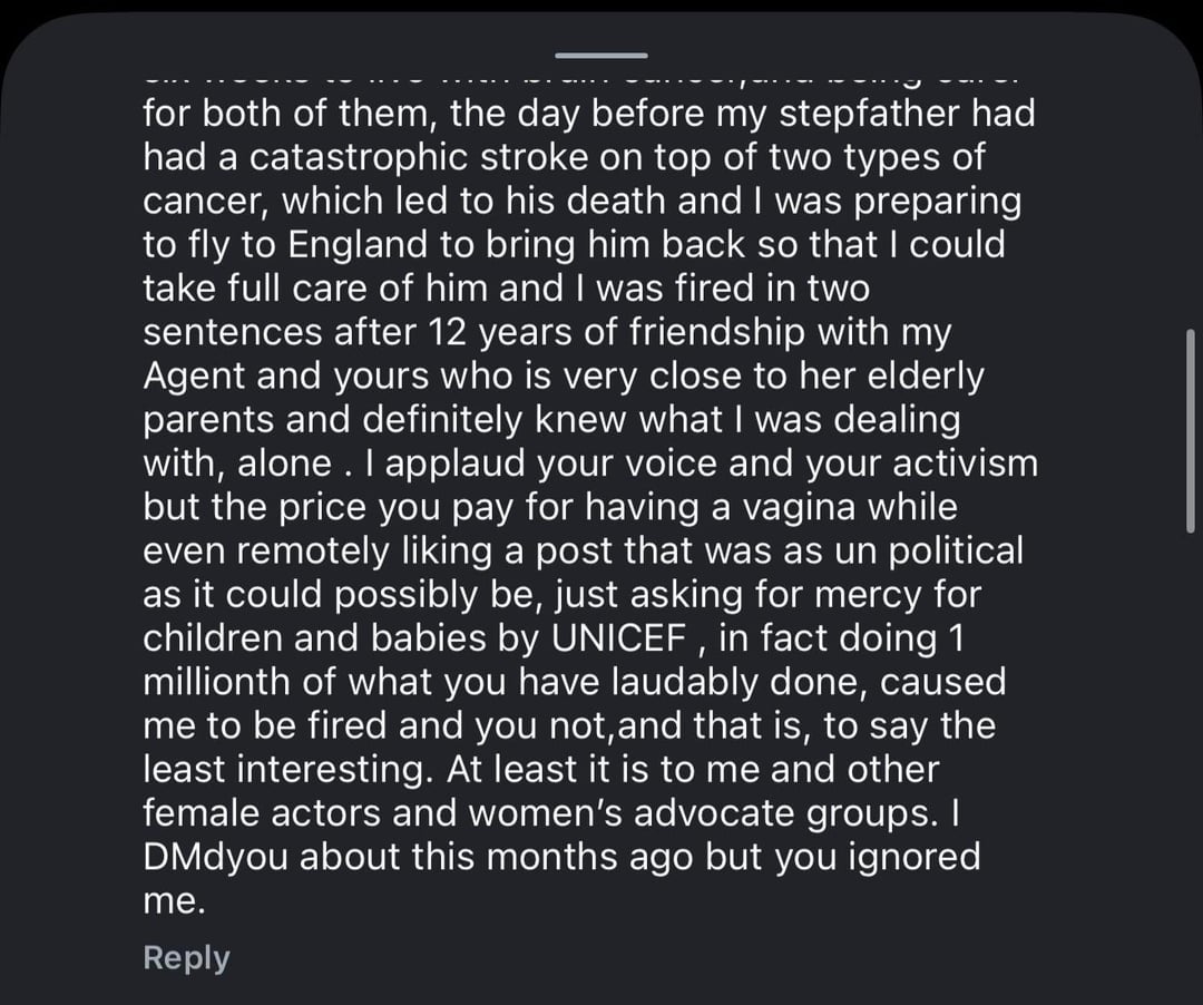 This is genuinely so confusing. She’s mad at him for not getting fired? Or is she mad at him for not responding to a DM? He must get thousands of DM’s a day, and most likely doesn’t even manage his own socials.