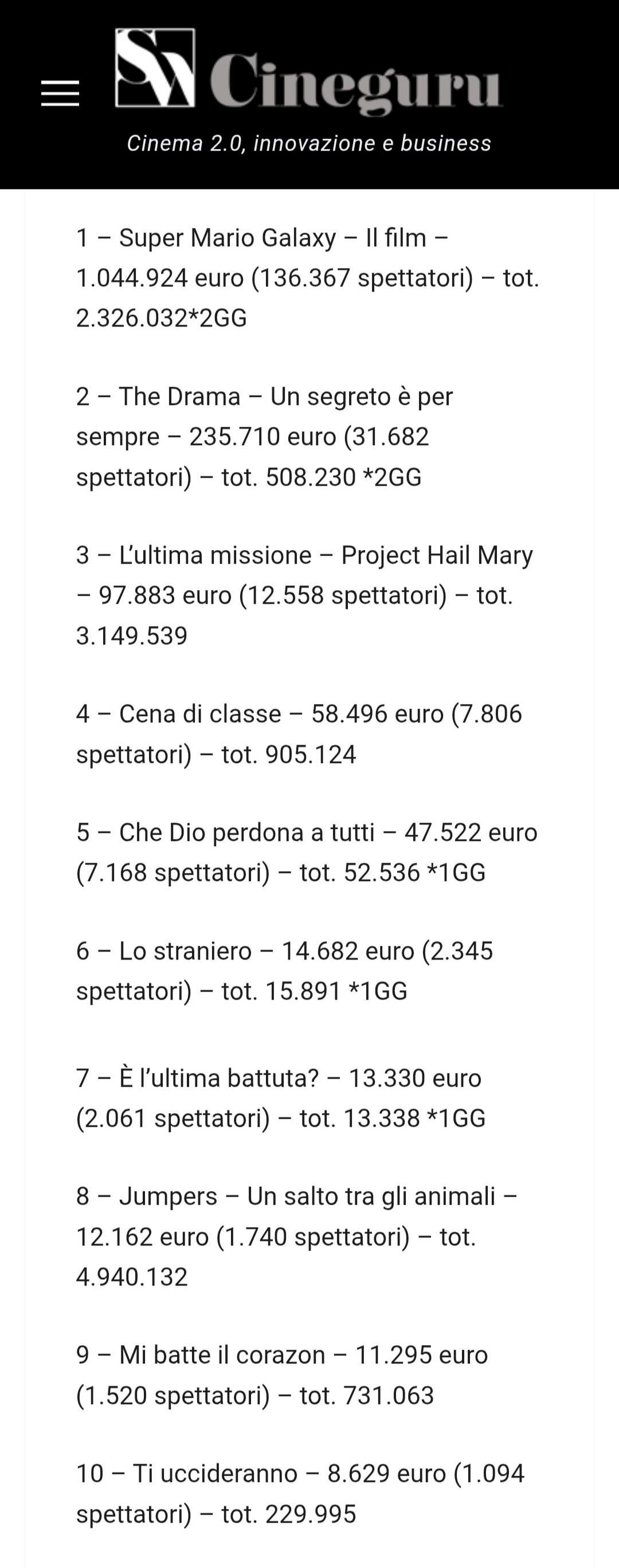 >Unsurprisingly, Super Mario Galaxy The Movie leads the way with a second-day haul of €1,044,924 and an average of €2,120 in 493 theaters. The Nintendo/Illumination animated film grossed €2,326,032 in its two-day run, in line with the first Super Mario Bros. The Movie.