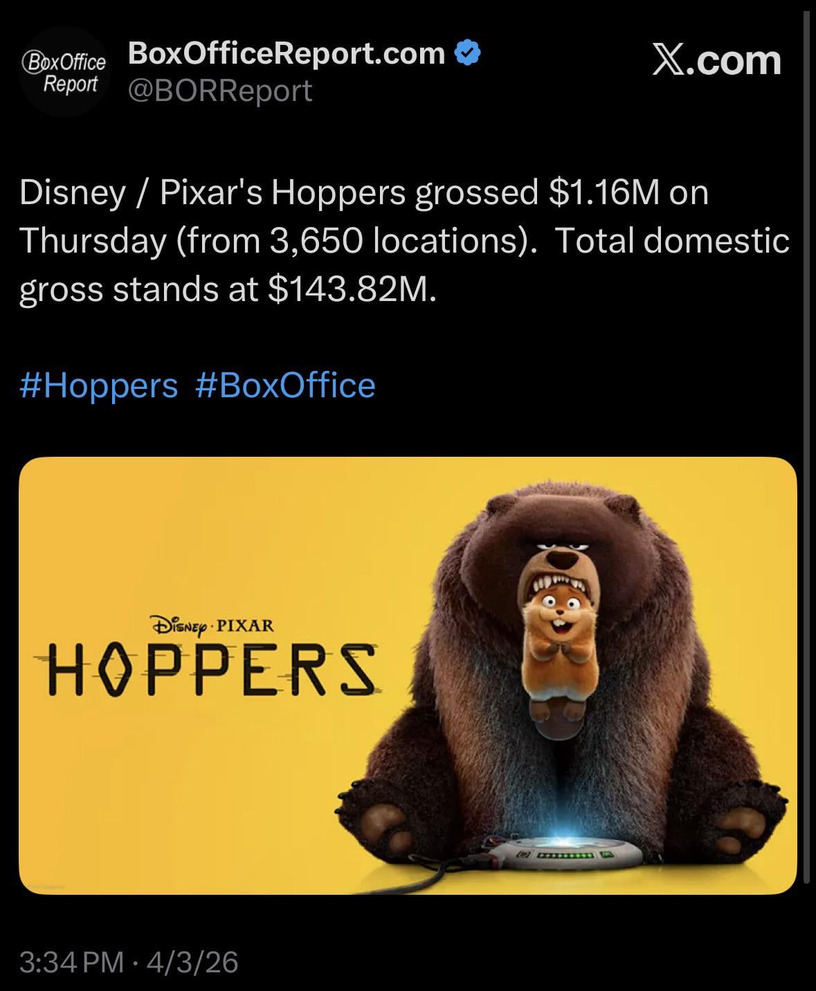 I think this could stabilize well from here. At the very least, at my local theater, there’s an overflow into Hoppers when Mario and PHM showtimes lose all the reserved seats not in the front row. GOAT is getting pushed out of the marketplace so Hoppers is Mario counterprogramming and is still over 3,000 screens a month in. It won’t have competition that will steal screens away in big chunks until Michael and Devil Wears Prada 2 at the end of April.