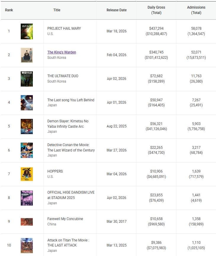 Project Hail Mary: The movie will cross 1.4 million admits tomorrow as PHM is the first movie to be above The King’s Warden since February 11th, where Humint beat The King’s Warden for a single day before getting lapped.