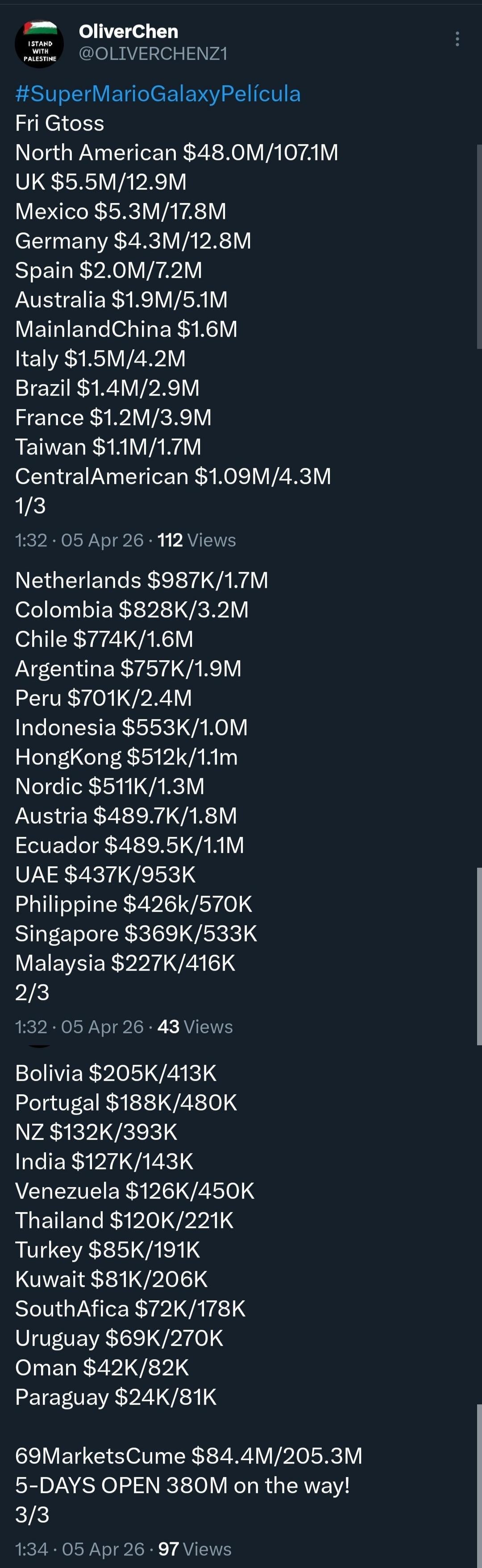 Looks like $51M SAT for #TheSuperMarioGalaxyMovie. $158M+ cume. 5-day Easter weekend on track to be around $190M.April 5, 2026