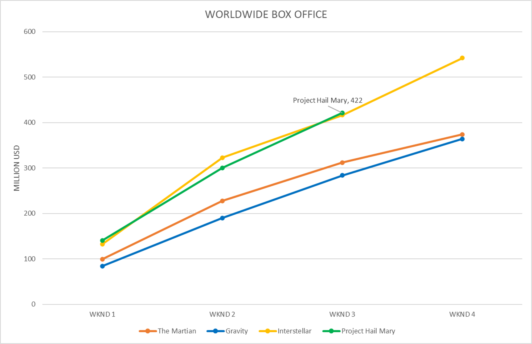 Project Hail Mary Worldwide Gross after 3rd Weekend ($422M) vs The Martian ($312M), Interstellar ($417M), Gravity ($284M)