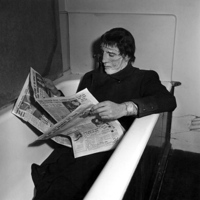 Christopher Lee takes a break while filming The Curse of Frankenstein (1957)