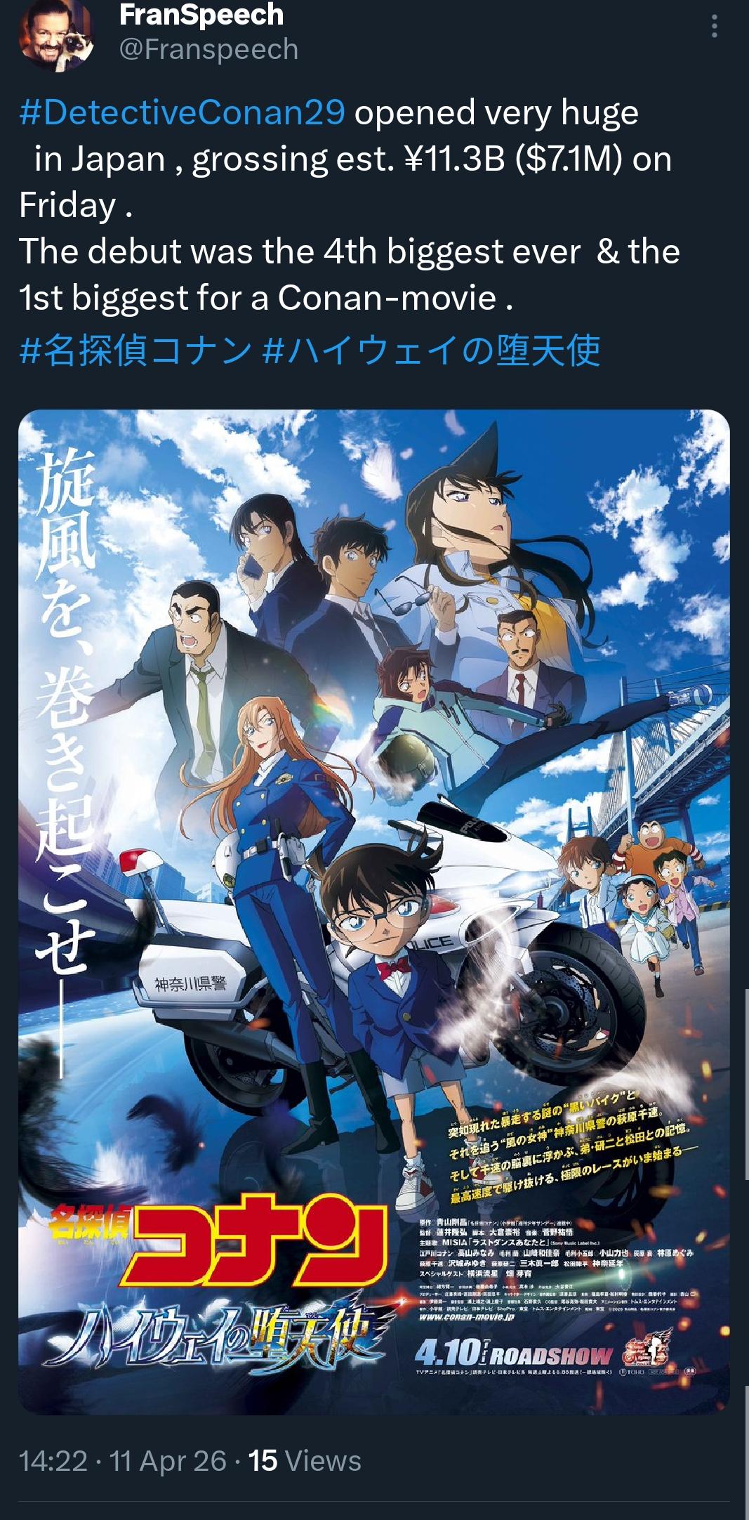 🇯🇵 DetectiveConan29 opened very huge in Japan, grossing est. ¥11.3B ($7.1M) on Friday. The debut was the 4th biggest ever & the biggest for a Conan-movie. #名探偵コナン #ハイウェイの堕天使