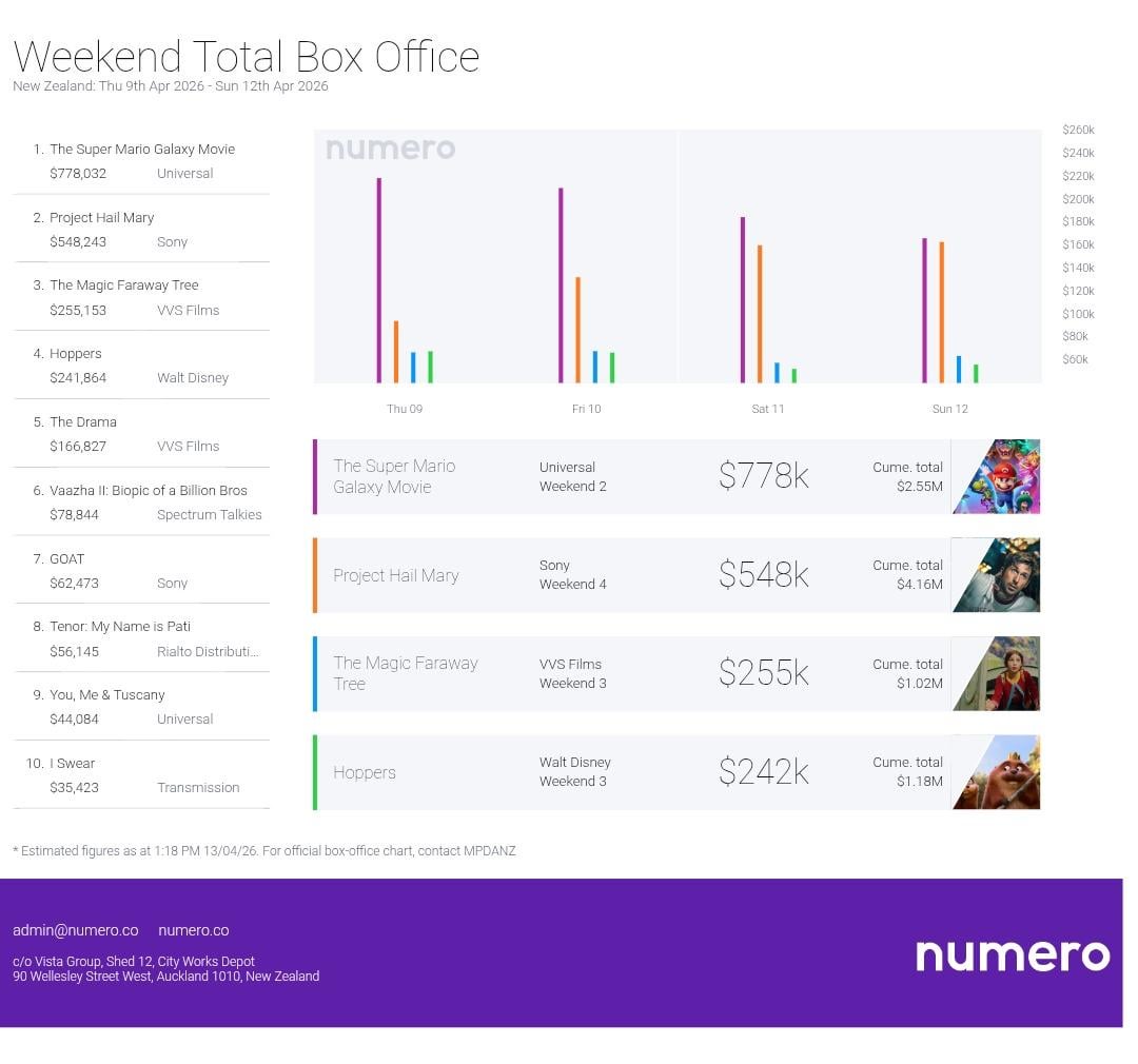 The Super Mario Galaxy Movie held the top spot in its second weekend at the New Zealand box office with $778k. 🎟️Project Hail Mary is still in the No. 2 spot in its fourth weekend in cinemas with $548k. 🎟️The Magic Faraway Tree is in the No. 3 spot in its third weekend in cinemas with $255k