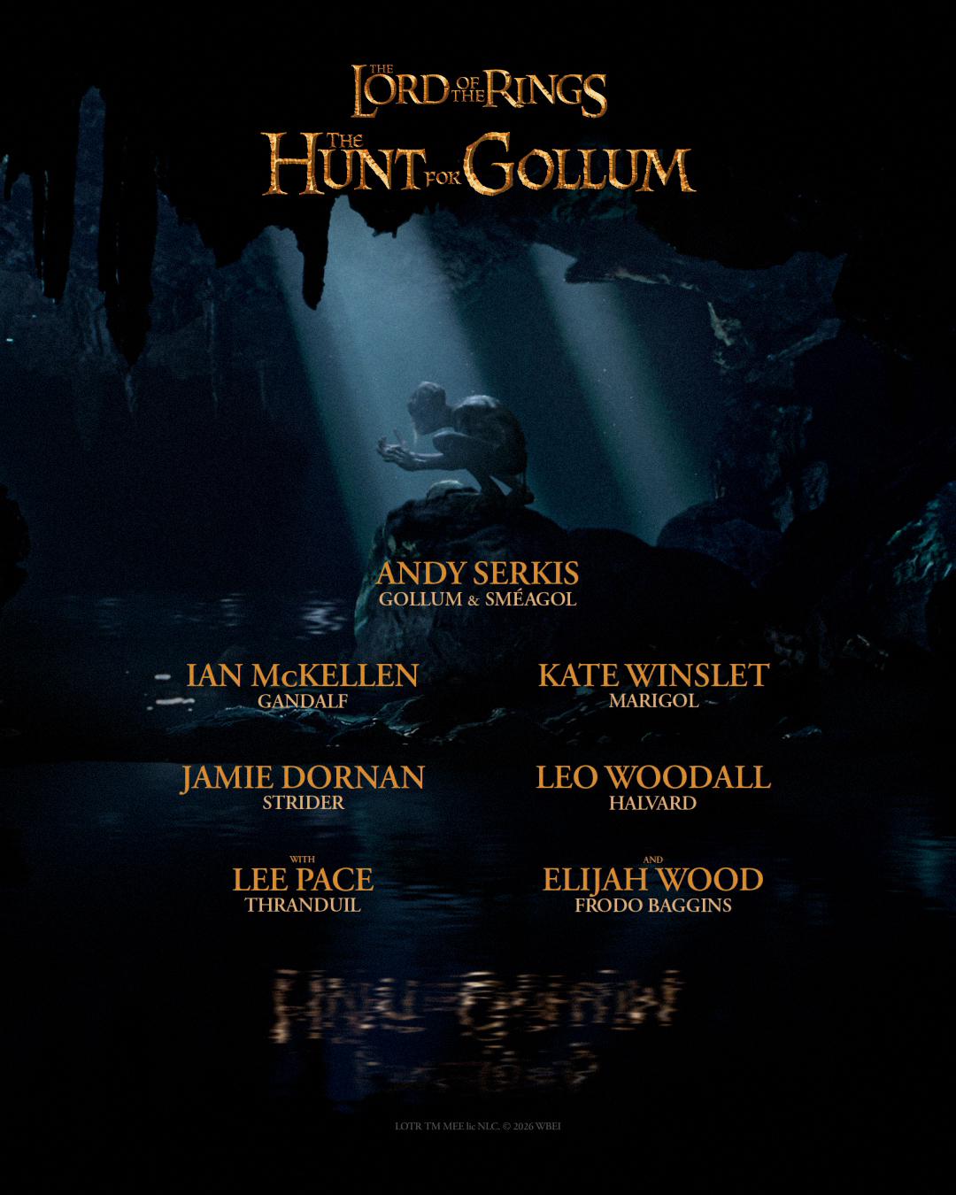 Andy Serkis (Gollum), Ian McKellen (Gandalf), Kate Winslet (Marigol), Jamie Dornan (Strider), Leo Woodall (Halvard), Lee Pace (Thranduil), and Elijah Wood (Frodo Baggins) will star in ‘The Lord of the Rings: The Hunt for Gollum’.
