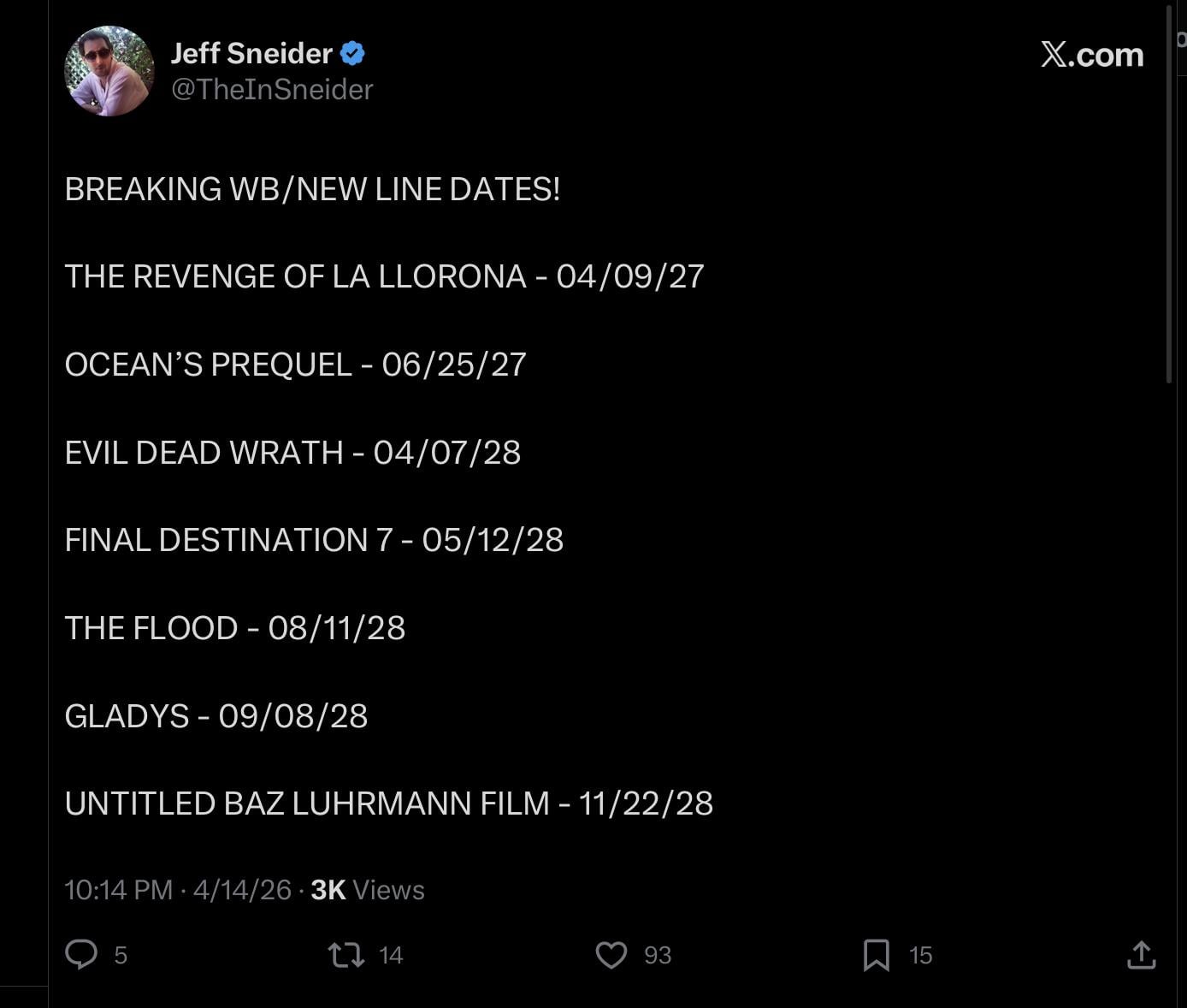 So that got the Ocean’s prequel, Man of Tomorrow and A Minecraft Sequel all coming out 2 weeks apart from each film.