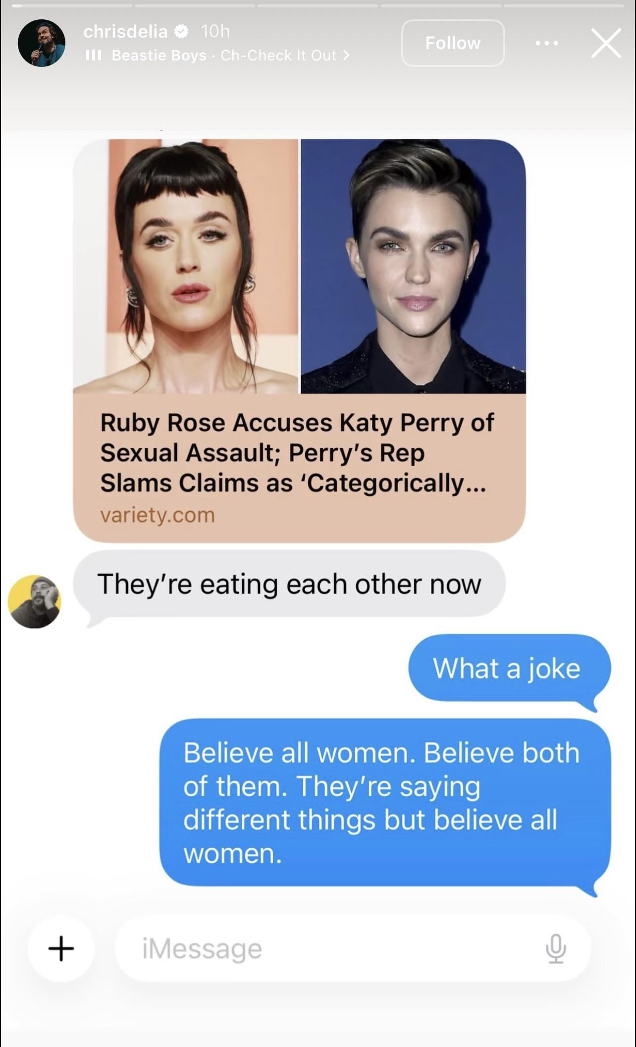 Chris D’Elia is a creep and slid into my dm’s in the sneakiest way back in 2018. Invited me to his comedy shows so we could hook up and when I apologized and told him I really wasn’t the type of person who could do that he was like “uh. Okay. You’re weird. 👍” And that was the end of that lol