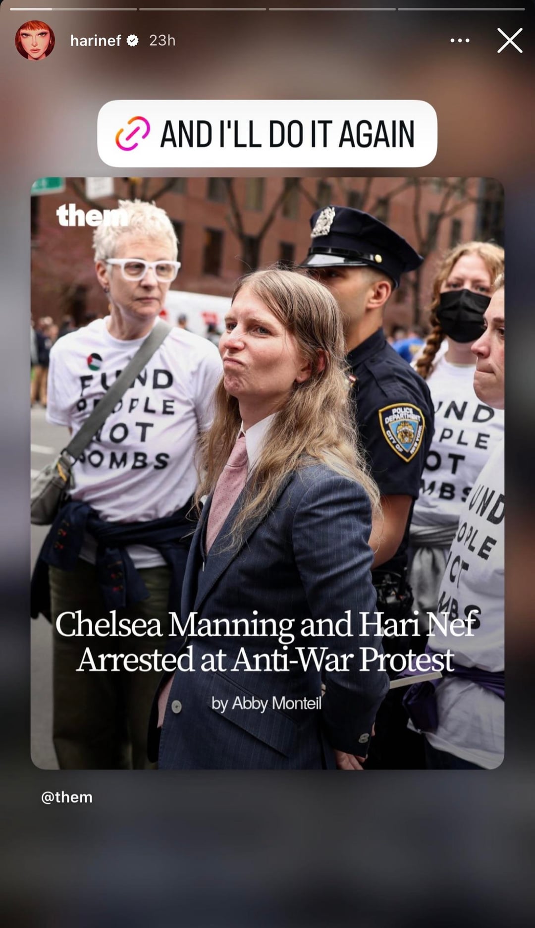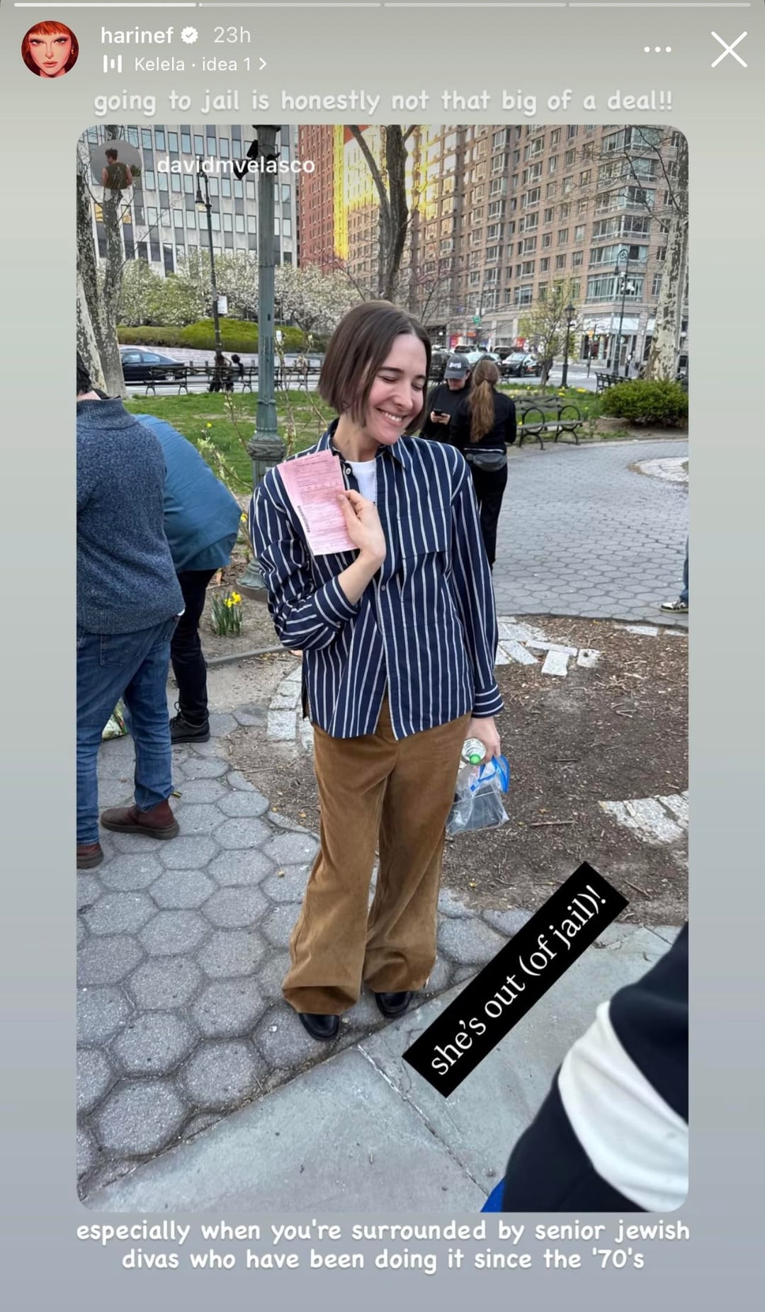 Actress Hari Nef on being arrested at NYC protest over US arms sales to Israel: “and I’ll do it again. going to jail is honestly not that big of a deal!! especially when you’re surrounded by senior jewish divas who have been doing it since the ’70’s.”