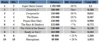 Total ticket sales this week ended up in a similar place to that first week of winter break, ie just under 3M, higher than the same week in 2025 & above average for post-2019 results in France overall. The dominance of one event release (*Mario* this time around, *Marsupilami* earlier in the year) is undeniable: other continuing releases held decently this week. I’ll come back to family films later, but local releases *Rays* & *Compostella* both had a steady WoW performance at the box-office (removing opening week preview admissions from the equation for the latter). It doesn’t make them break-outs but WOM & screenings in more markets this week are paying off, perhaps paving the way for the next two weeks. *Project Hail Mary* is heading towards a sub-1,5M performance, which is a noticeable discrepancy versus domestic in usually sci-fi friendly France.