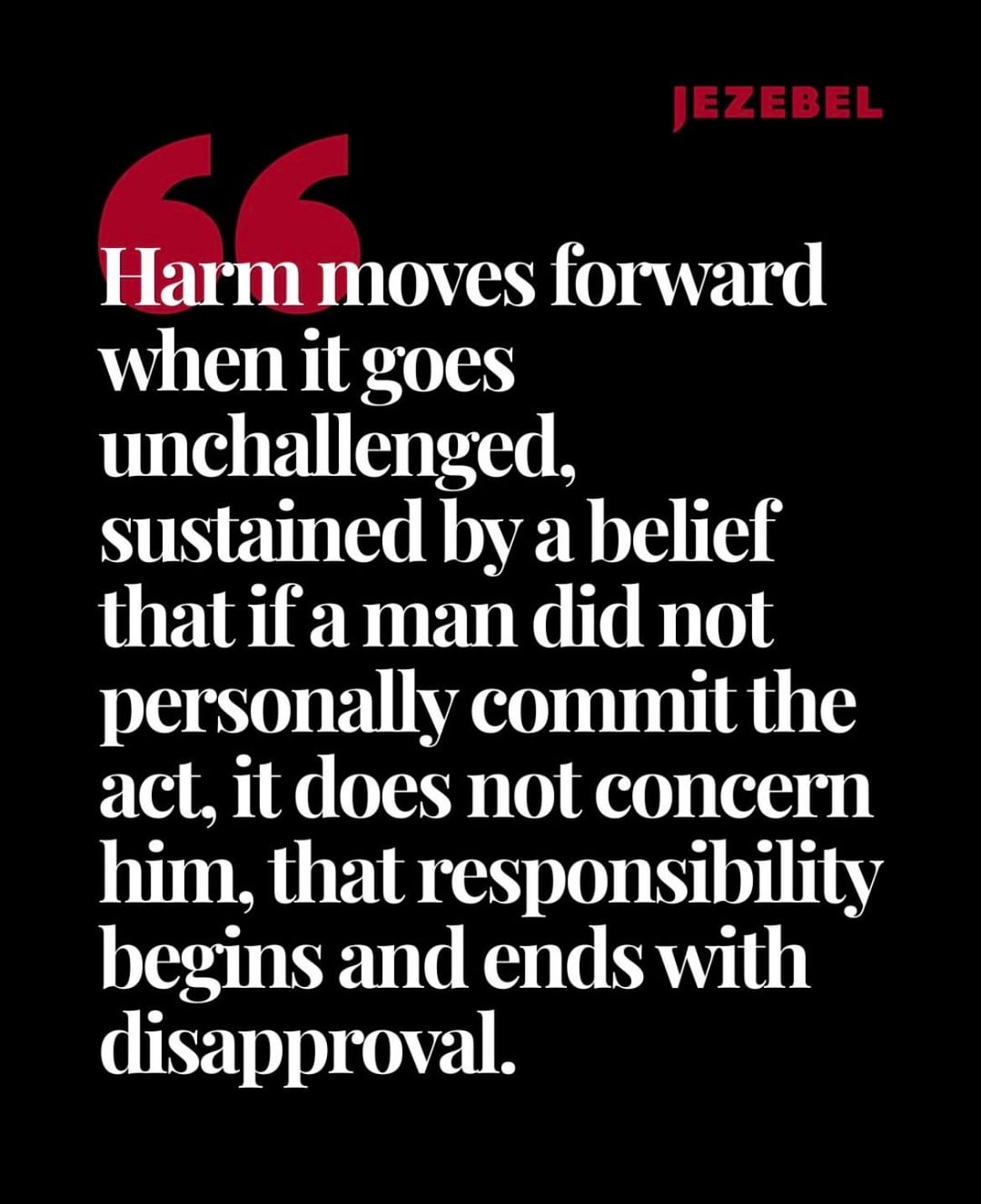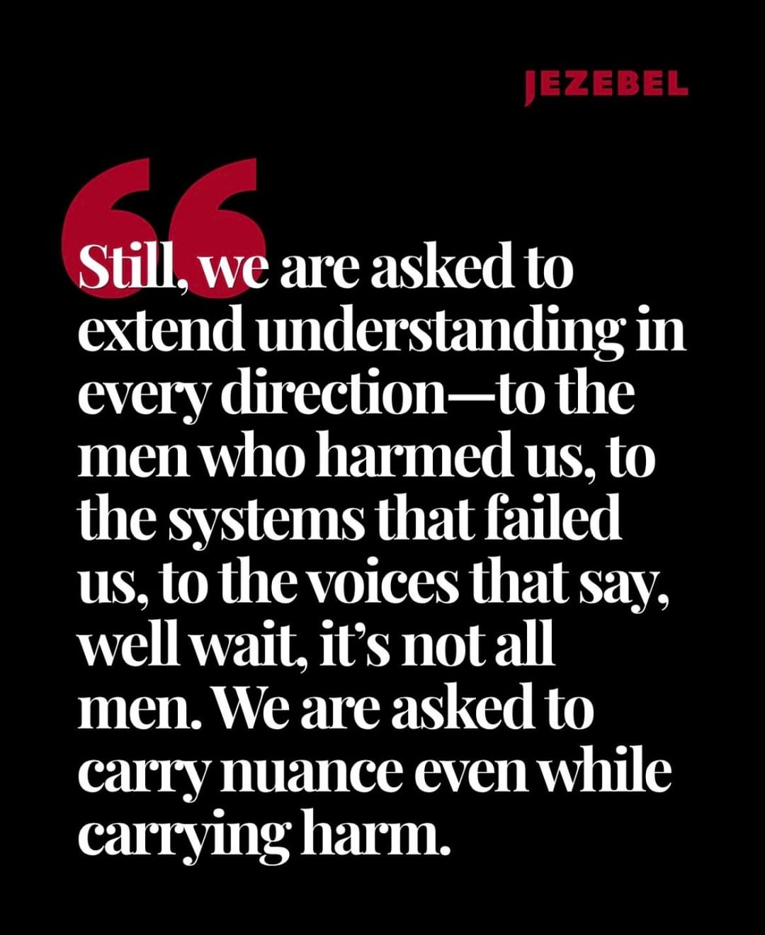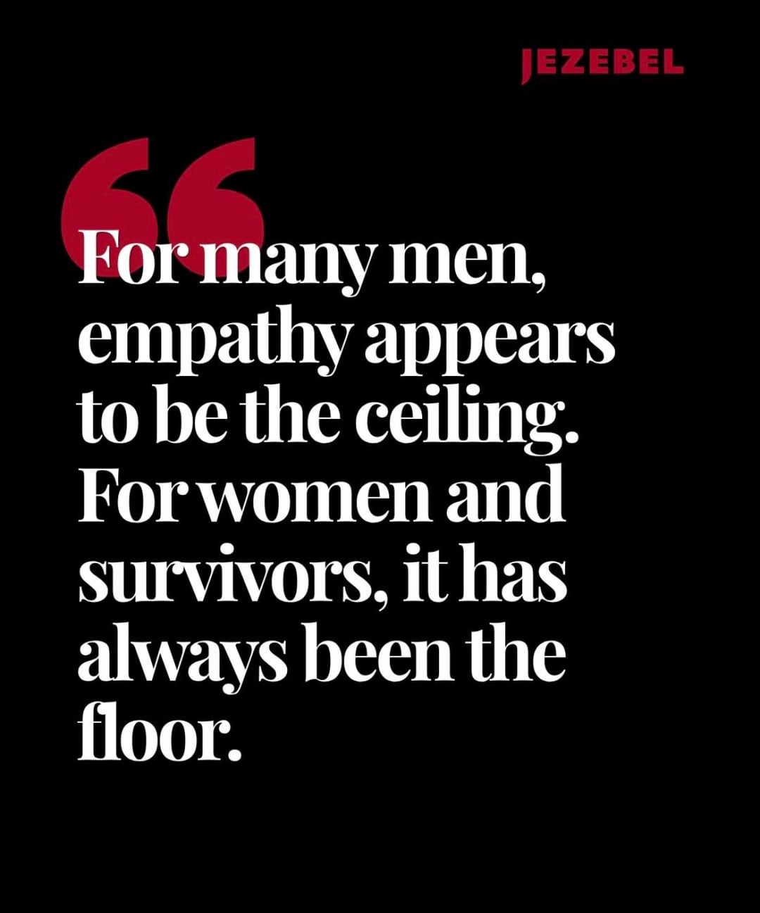 I genuinely don’t think men have any idea how prevalent the abuse is. Or maybe they do and they don’t care and/or they’re complicit. I’m a CSA survivor and apparently not typically “male” in my relationships, women say I’m like a woman in my intimacy. May sound like a humble brag but it’s caused a lot of self-doubt and identity crises. Anyway, there is a related point coming…