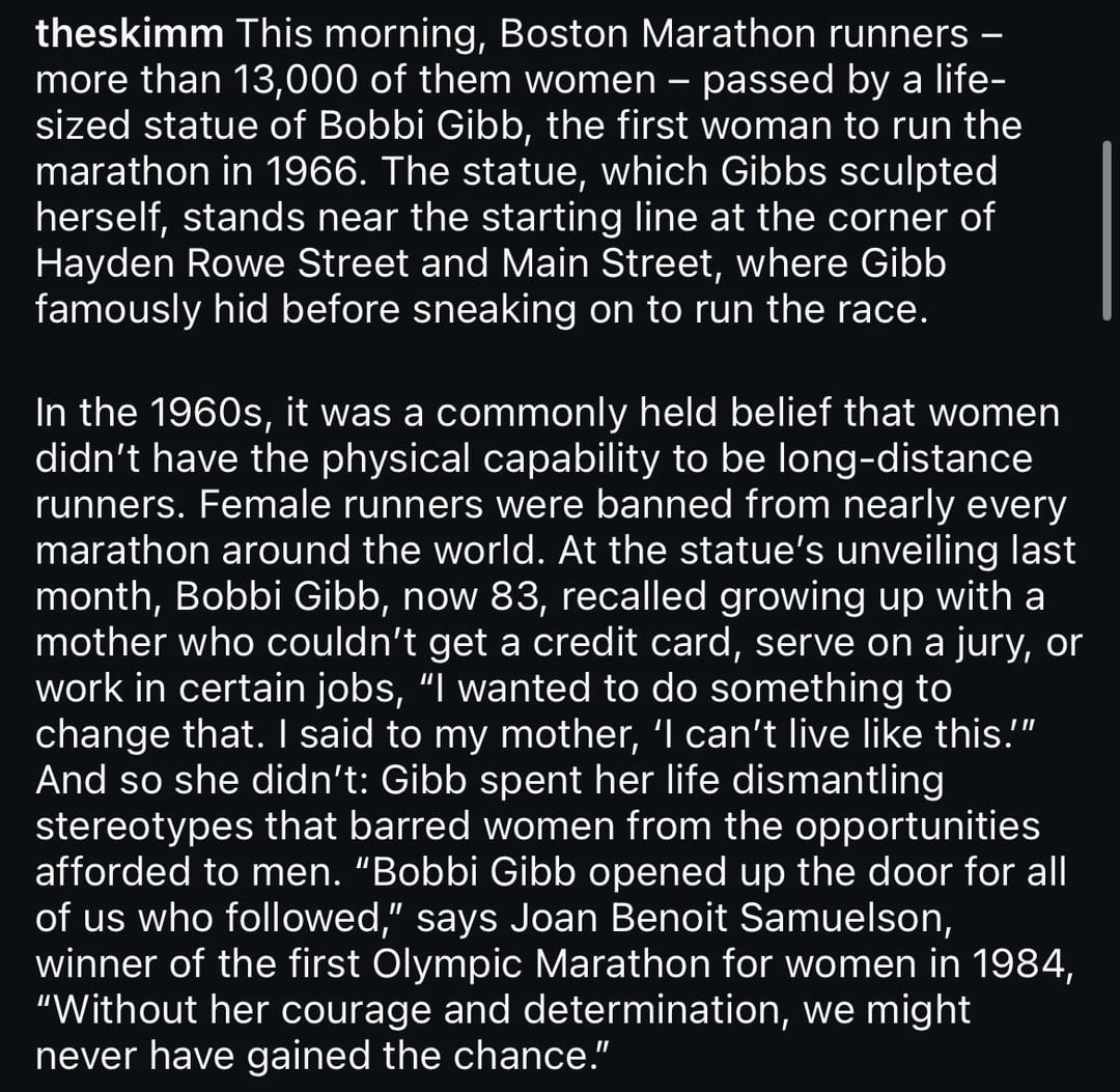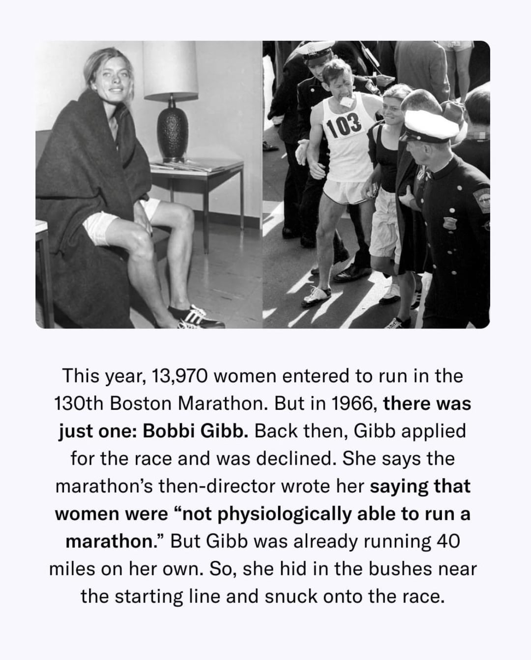 cucumberbun on April 21, 2026 12:45 am And in khaki shorts no less. The next year, another female runner ran under her initials to trick the organizers, and the marathon manager tried to legit push her off the route.