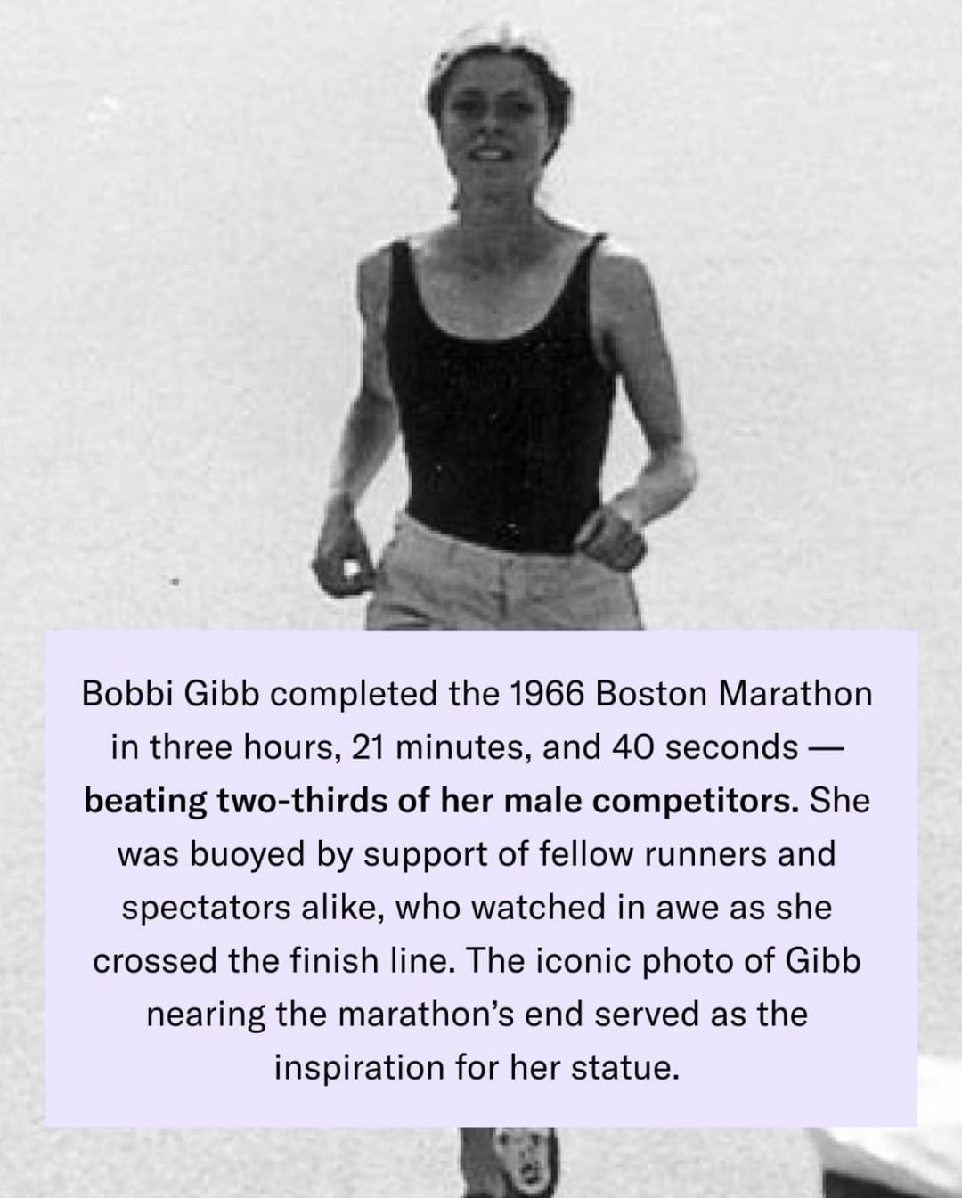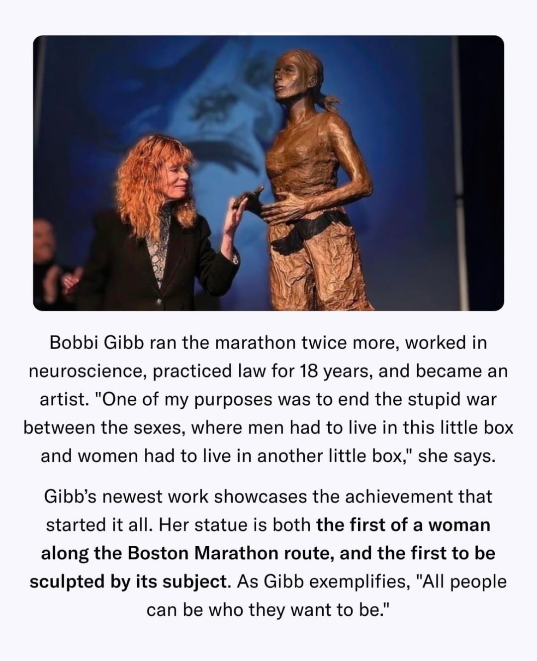 The first woman to run the Boston Marathon, Bobbi Gibb, now has a statue on the route – and she sculpted it herself. by mlg1981