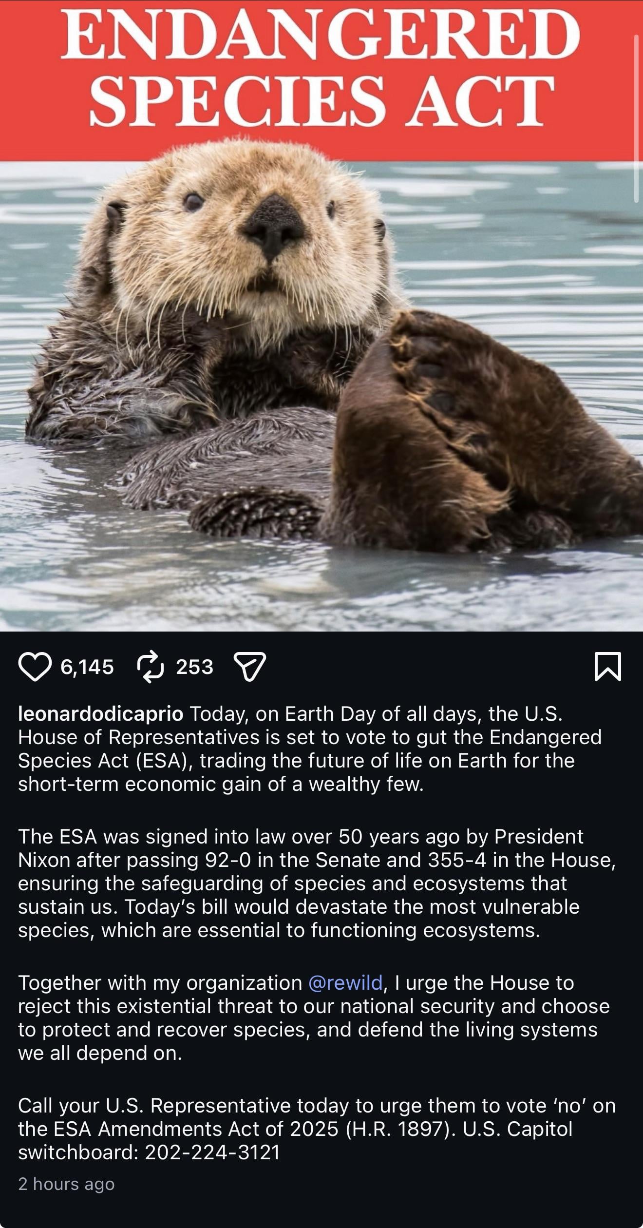 But it’s still a good thing to advocate for this stuff and bring awareness. So don’t see why we need to bring down the Endangered Species Act just because we don’t like Leo.
