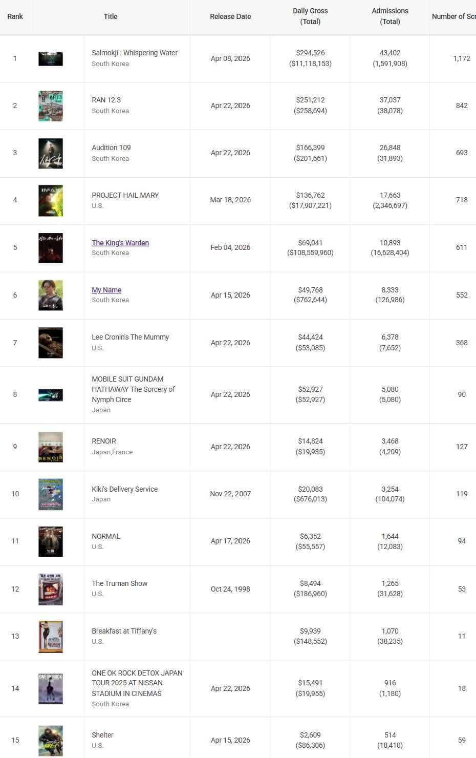 The Man Who Lives With the King: The movie is starting to drop hard as it will cross 16.7 million admits this weekend.