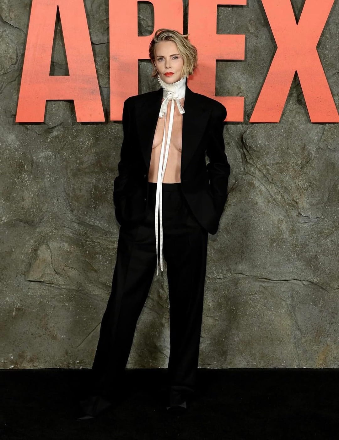 Charlize Theron goes topless under a Dior suit at the premiere of her new movie “Apex,” which hits Netflix on Friday, April 24.