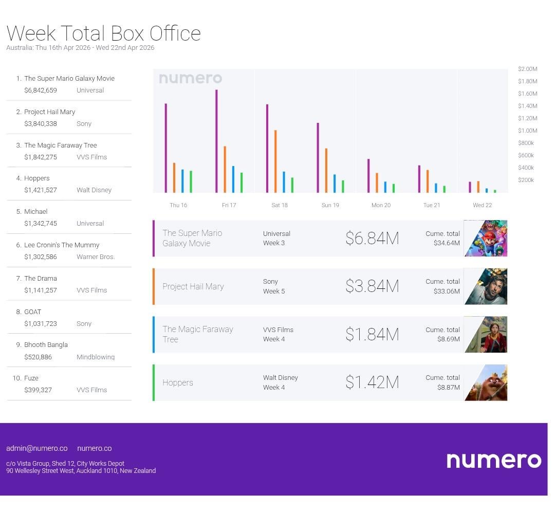 The Super Mario Galaxy Movie added $6.84M in its third week in Australian cinemas, bringing its total box office to $34.64M. 🐨 Project Hail Mary took $3.84M in its fifth week in cinemas, bringing its total box office to $33.06M.April 23, 2026