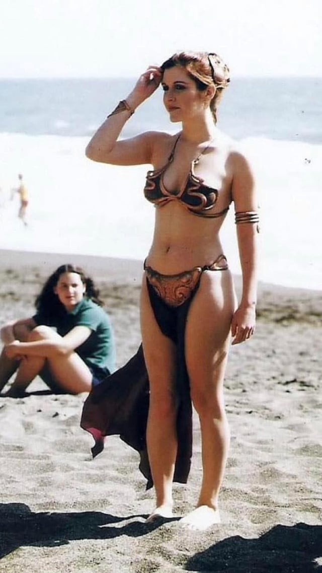 What a beauty that was in many boys dreams 😃 In the one pic Carrie is wearing her iconic “Slave Leia” bikini, sunbathes alongside her identically dressed body double Tracy Eddon on the set of Return of the Jedi.
