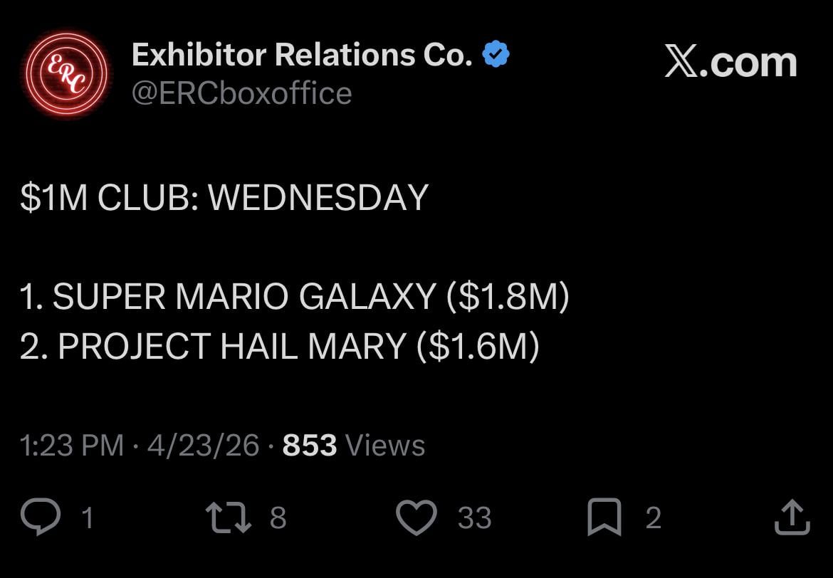 $1M CLUB: WEDNESDAY 1. SUPER MARIO GALAXY ($1.8M) 2. PROJECT HAIL MARY ($1.6M) by SignatureOrdinary456
