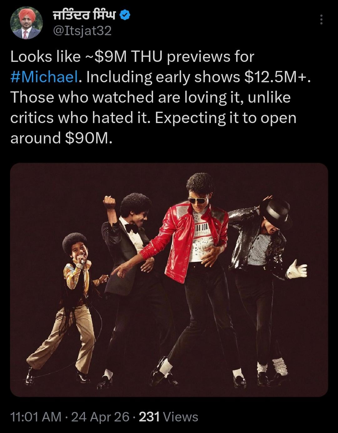 Looks like ~$9M THU previews for #Michael. Including early shows $12.5M+. Those who watched are loving it, unlike critics who hated it. Expecting it to open around $90M.