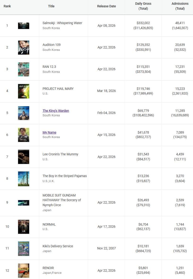 Salmokji: The movie will hit 1.7 million admits tomorrow as the movie is looking to land north of 1.9 million admits after Sunday’s update. Another strong weekend is very likely.