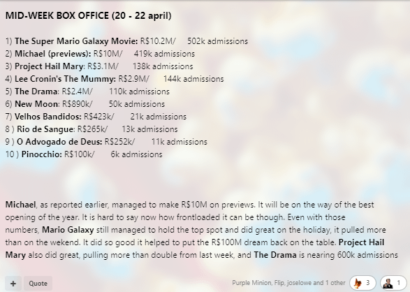 Brazil mid-week (20-22 april). Michael opens with record previews, but Mario holds on topApril 24, 2026