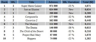 *Mario* just narrowly misses out on a third week as an admissions millionaire (971k) & is now trending noticeably below the first film in the series with a still impressive 4M admissions vs 4.7M for *SMBM* at the same point in it’s own lifecycle. That 20% shortfall doesn’t seem to be particularly correlated with audience feedback: *SMG*’s 3.6/5 on Allociné & a near 6/10 on the more high-brow Sens Critique site is on-par with Illuminations’ output. If audiences did take a mulligan on theaters this week (holiday plans, outdoor activities), then at least the plumber can boast one of the best holds from last week, alongside *Jumpers* & *I Swear*.
