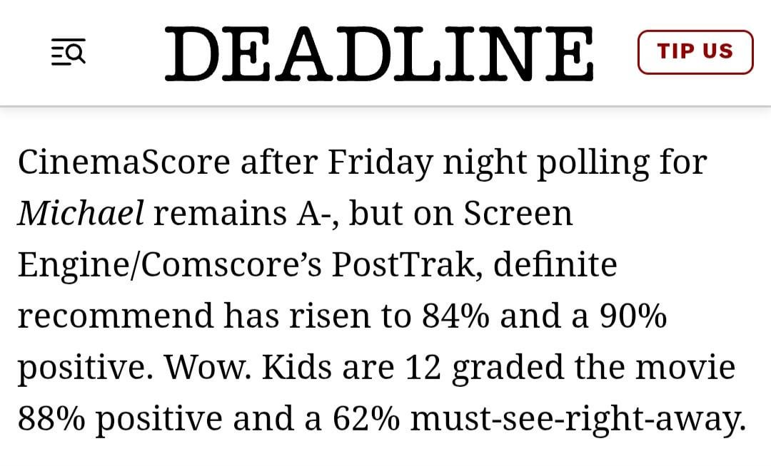 Per Deadline, updated PostTrak scores for ‘Michael’ are 90% positive and 84% definite recommend. The audience was 38% Black, 26% Latino/Hispanic, 24% Caucasian, and 6% Asian, as well as 61% female and 39% male.