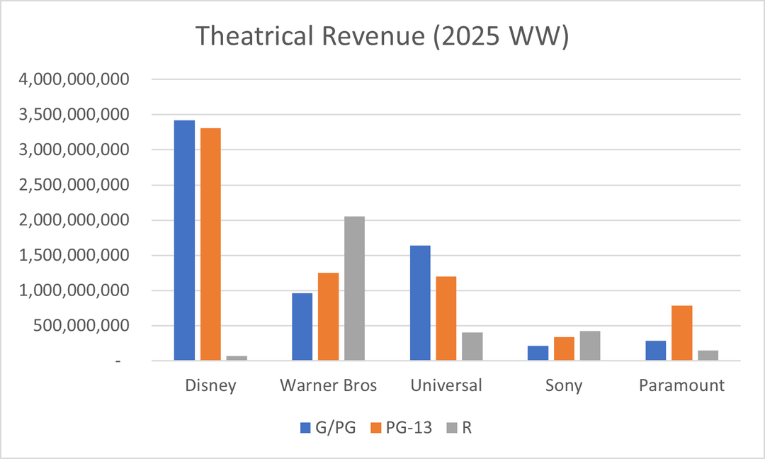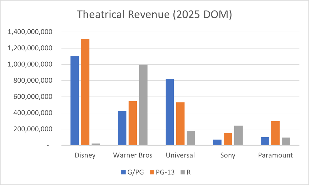 A question for those who are more experienced with the BO: The overall data shows that Disney and Warner Bros. gravitate more towards PG/PG-13 and R rated films respectively in their film releases. Is this to avoid competing with each other for the same audience? Or is there some cultural background behind this (I am on the younger side so I am not too informed on the history of the major US studios)