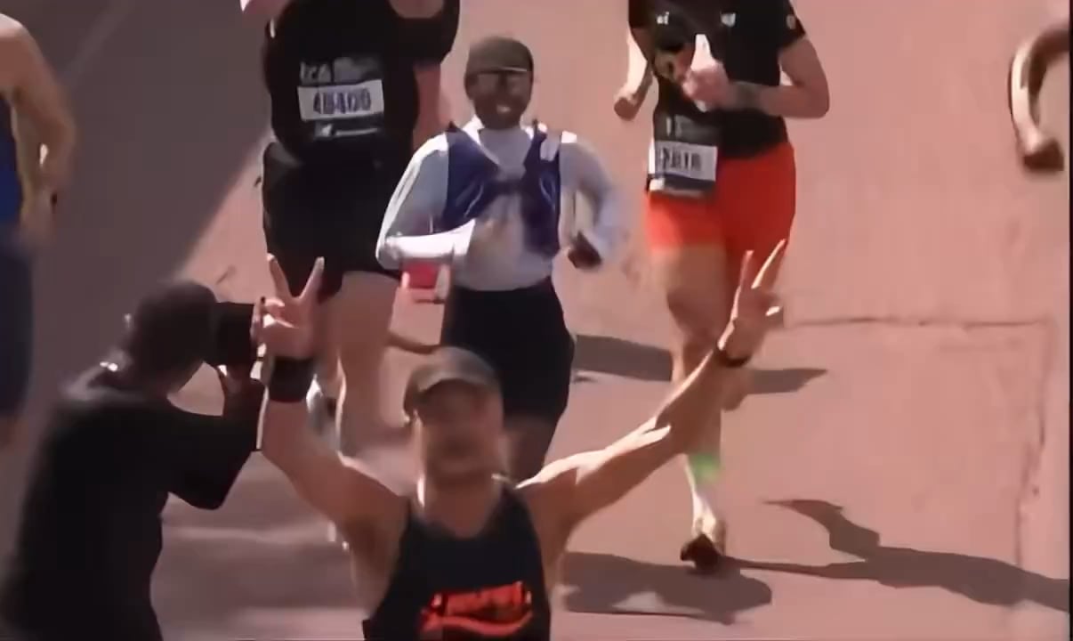 Cynthia Erivo crosses the finish line of the London Marathon while Defying Gravity plays. She finished the marathon in 3 hours, 21 minutes and 40 seconds.
