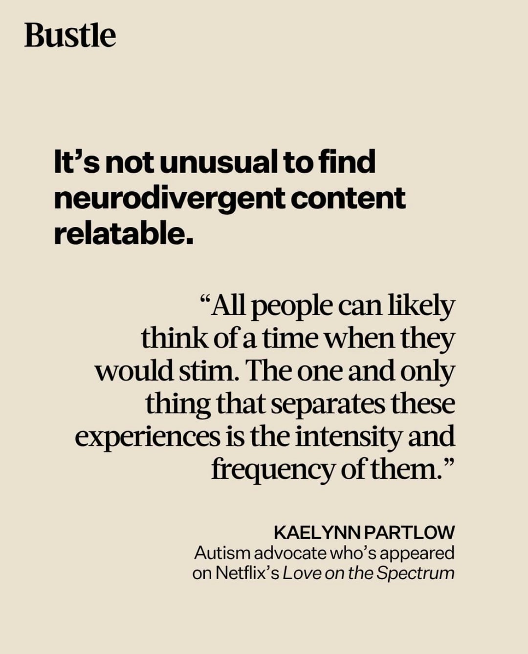 To be fair about the “overstimulation” part, I think a lot more people experience this than they realize. I have so many instances of being overstimulated as a kid and adolescent, but they didn’t present as stereotypical autistic. I didn’t have the language back then to understand why I would hit a wall (in different ways). Fast forward to six months ago and I’m diagnosed AuDHD at 43, and suddenly everything made sense.