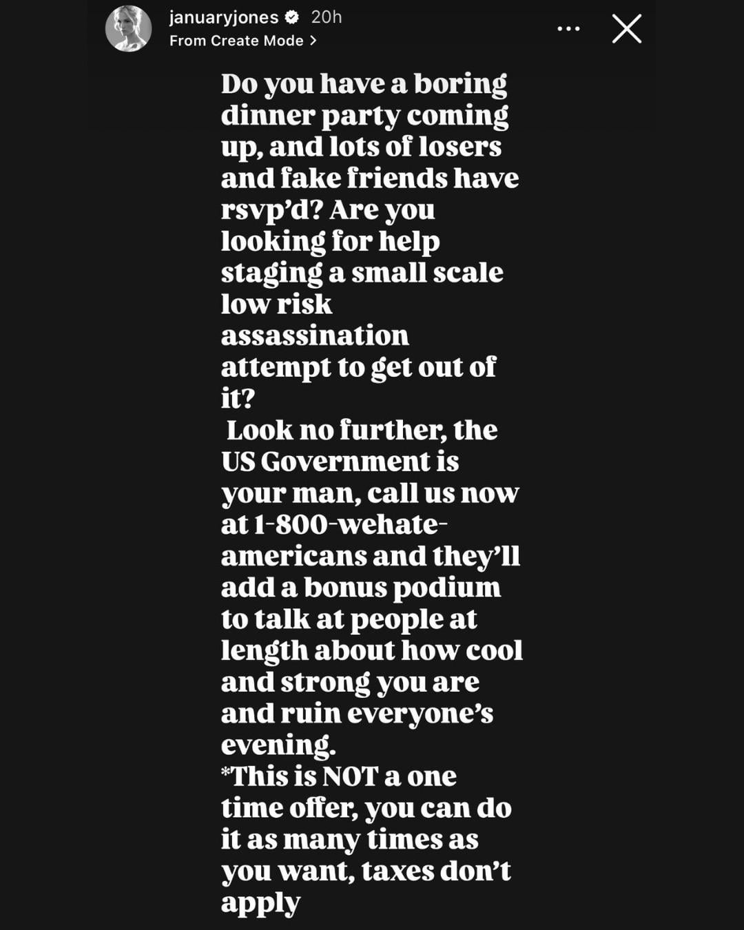 January Jones via IG: “Do you have a boring dinner party coming up, and lots of losers and fake friends have rsvp’d? Are you looking for help staging a small scale low risk assassination attempt to get out of it? Look no further, the US Government is your man, call us now at 1-800-wehate-americans”