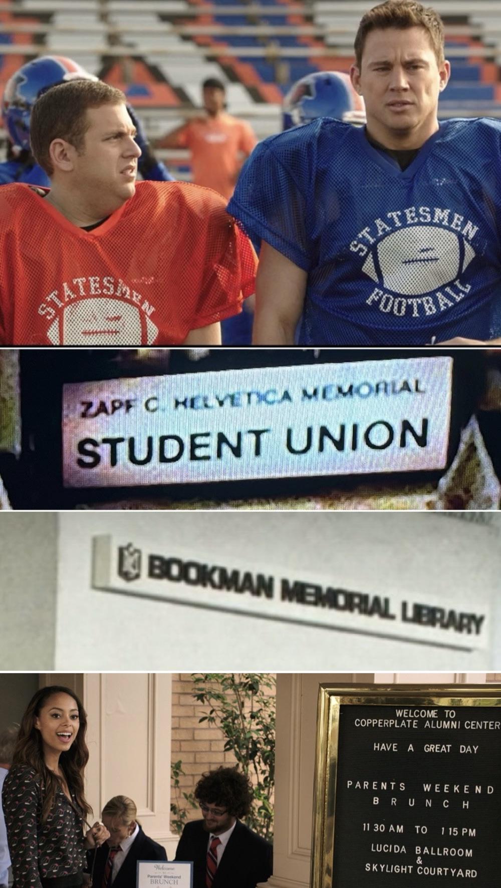 Share Facebook Twitter LinkedIn Pinterest Bluesky Threads In 22 Jump Street (2014), all the buildings and the mascot of the fictional university are just named after different fonts. by rpm319