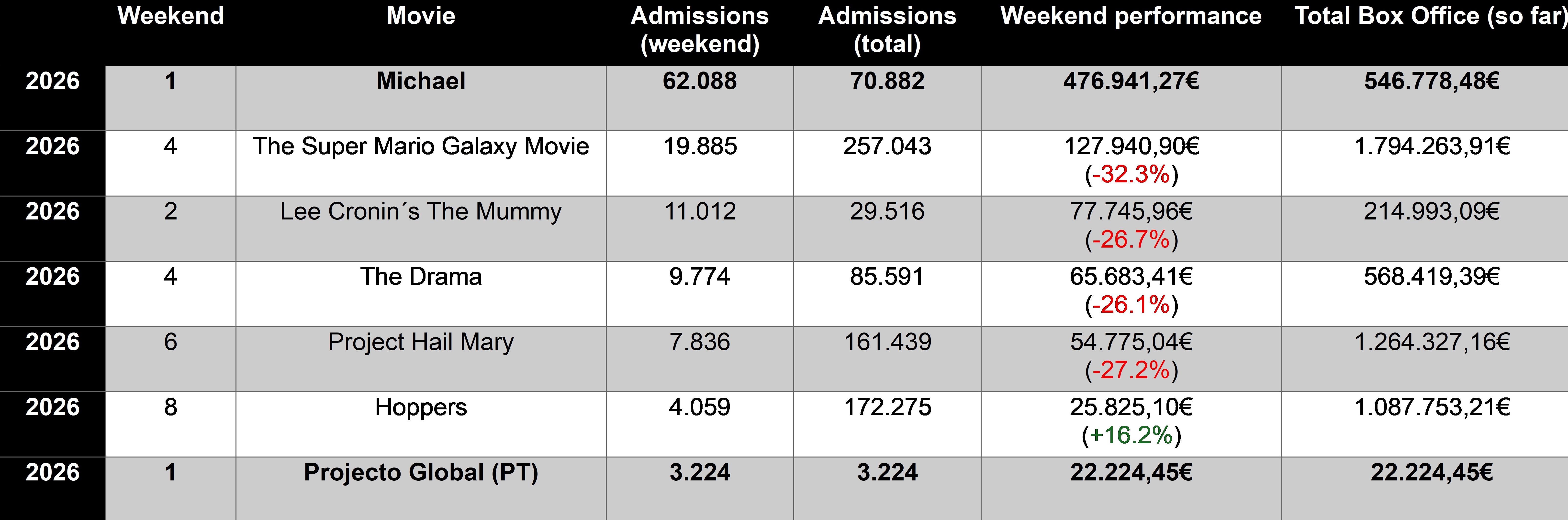 Viriato181 on April 27, 2026 4:30 pm Best opening weekends of 2026 (by tickets sold): * The Housemaid – 95.981 (5-day) * The Super Mario Galaxy Movie – 75.287 (5-day) * **Michael – 70.882 (5-day)** * Marty Supreme – 42.017 * Wuthering Heights – 35.772 * Project Hail Mary – 34.941 (including pre-screenings) * Hoppers – 34.116 Mario movies on the 4th weekend: * The Super Mario Bros. Movie – 1.989.016,90€ // 348.446 * **The Super Mario Galaxy Movie – 1.794.263,91€ // 257.043** Project Hail Mary drops: * W1: # * W2: -12.8% * W3: -26.0% * W4: -3.4% * W5: -51.0% * **W6: -27.2%**