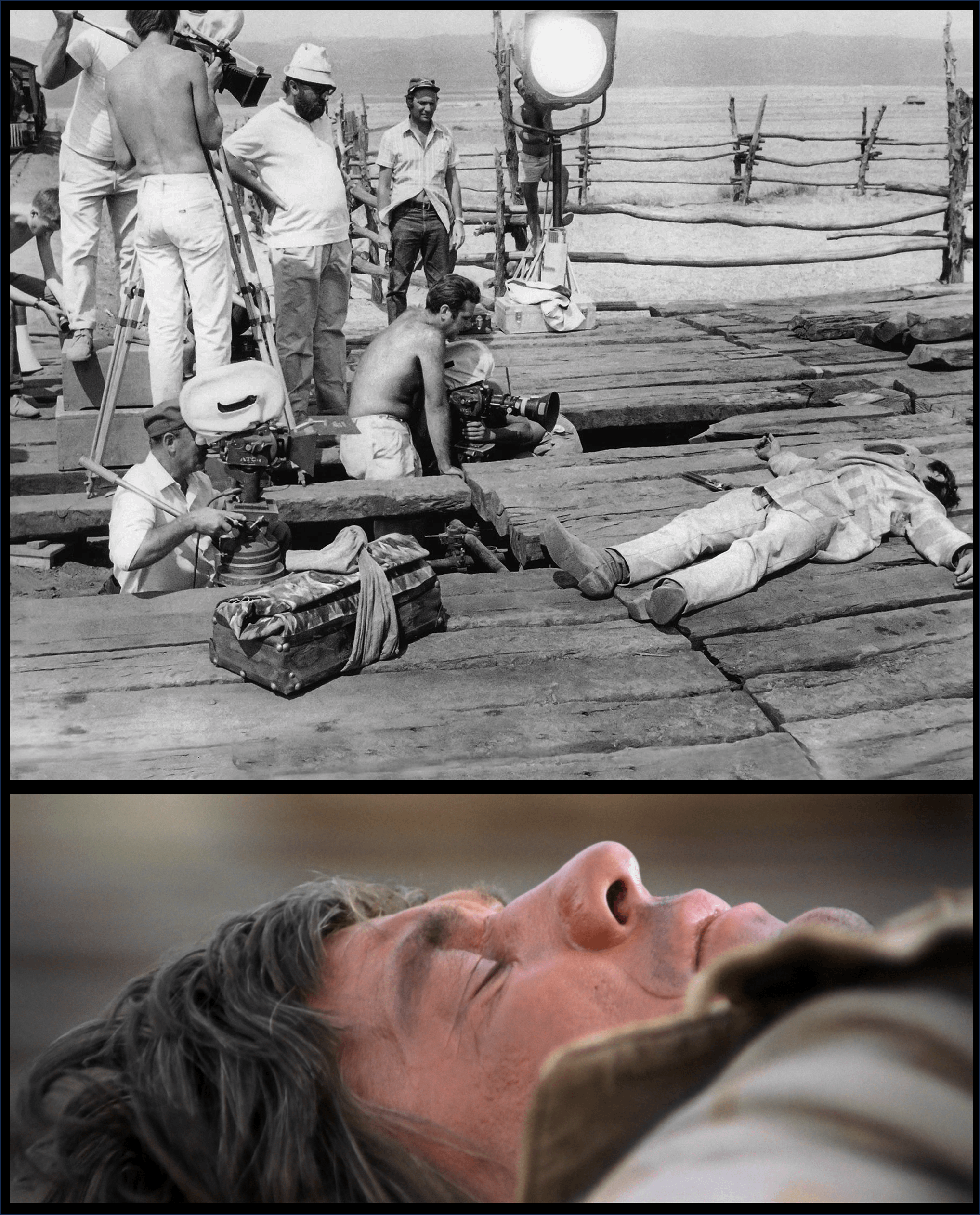 Sergio Leone and crew with Charles Bronson on location for Once Upon a Time in the West along the Gaudix-Hernán Valley Railway Line near La Calahorra, Granada, Spain, 1968